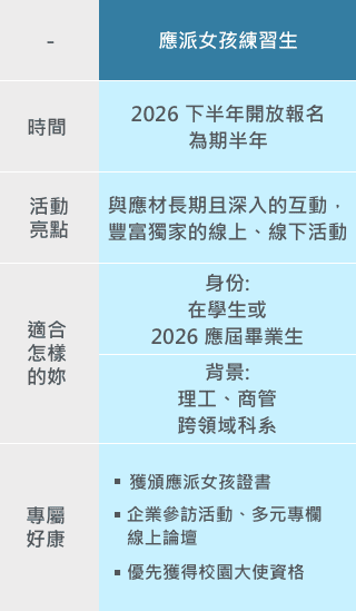 雖然還在學,但對科技業有高度興趣?理工、商管、跨領域背景的妳,跑在最前線參加練習生海選吧!和應派姊妺談心談職涯,半年中帶給你最深入、從線上到線下的互動,還能到手應材第一手資訊、優先面試資格
