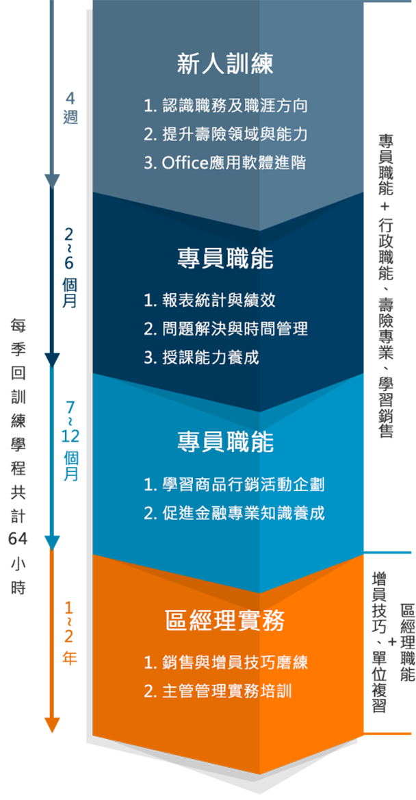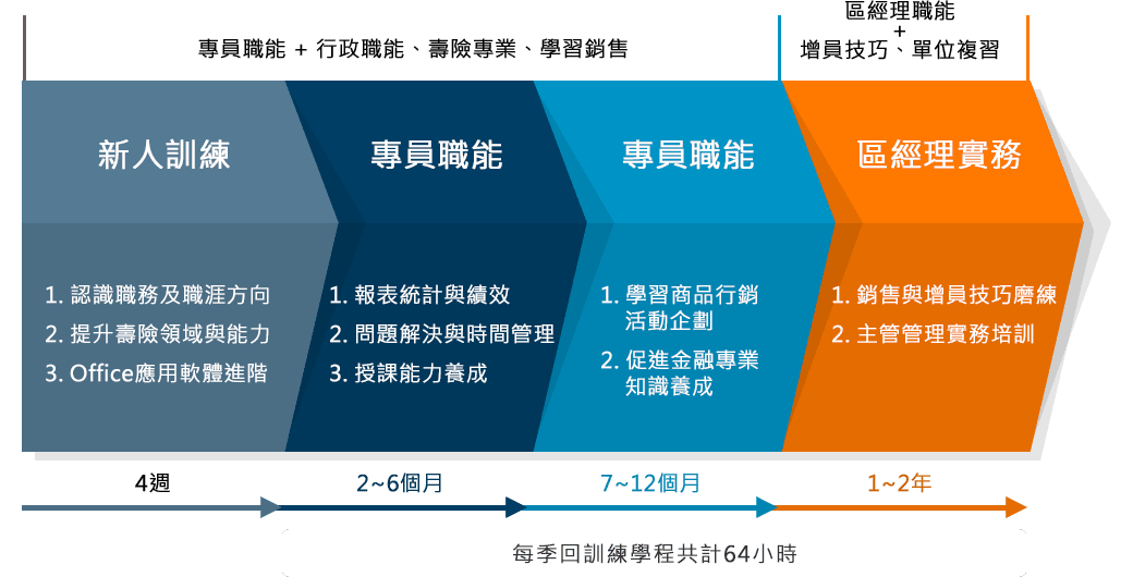 2年完整培訓計畫,輔以領航教練制度,協助組訓專員勝任各階段重點任務,透過課堂與實作,發展為優秀的業務儲備幹部。